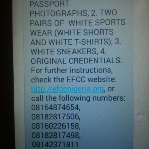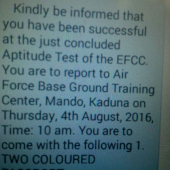 In a text message (picture below) sent out to “successful” junior candidate who had “just concluded the aptitude Test of the EFCC,” they are told to “report to Air Force Base Ground Training centre, Mando, Kaduna on Thursday 4th August 2016.”