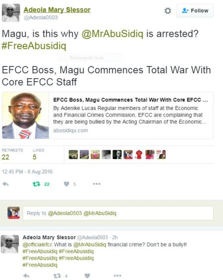 Others have also taken to twitter to demand that EFCC #FreeAbusidiq.
