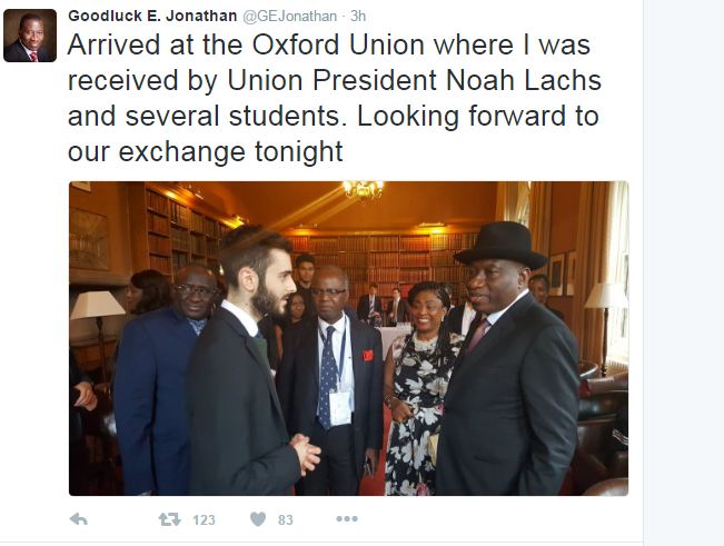 Through his official twitter account @GEJonathan announced that he had “arrived at the Oxford Union where I was received by Union President Noah Lachs and several students. Looking forward to our exchange tonight.”