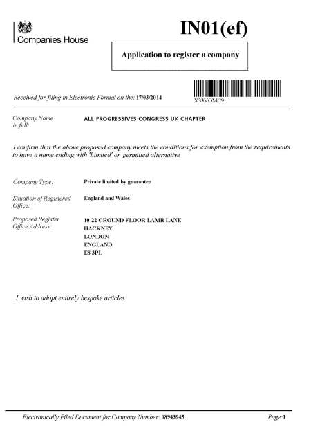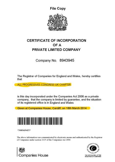 Philip also defies the contents of a letter he has been brandishing to deceive UK members dated 18th April 2016 and signed by Chief John Oyegun that he has been recognised as APC UK Chairman. Unknown to APC NEC/NWC in Nigeria, Philip and Michael had registered and have been running APC UK clandestinely with ACTIVE accounts and returns up to date with Companies House, Cardiff, UK since 2014. The status of the company remains ACTIVE and operational to date.