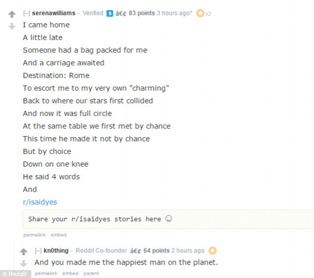The US tennis star who was sighted with her shinny new ring shared the news of her engagement in a poem via a Reddit Post.