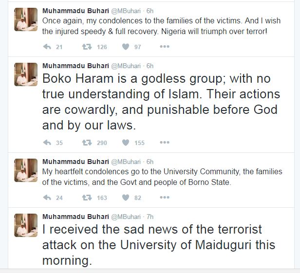 President Muhammadu Buhari condemned the attack, saying “My heartfelt condolences go to the University Community, the families of the victims, and the Govt and people of Borno State