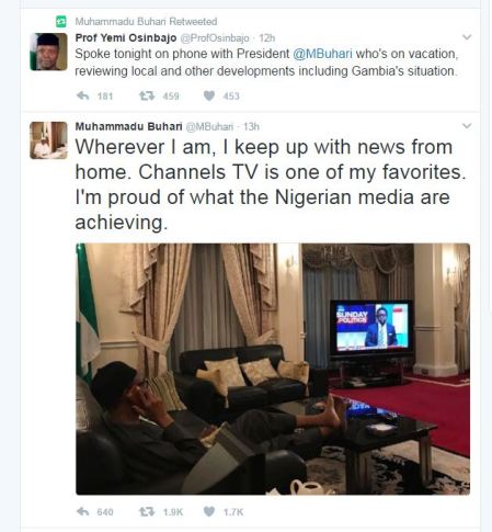 Professor Osinbajo said, “I spoke tonight on phone with President @MBuhari who’s on vacation, reviewing local and other developments including Gambia’s situation.”