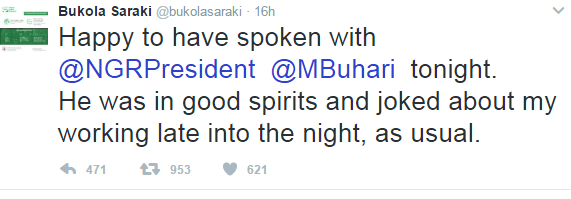 The Senate President, Bukola Saraki confirmed to his 597K followers that he had spoken to the President in the past 12 hours and he was “good spirits.”