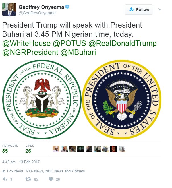 “President Trump will speak with President Buhari at 3:45 PM Nigerian time, today. @WhiteHouse @POTUS @RealDonaldTrump @NGRPresident @MBuhari,” the Minister wrote on his verified twitter account, @GeoffreyOnyeama.