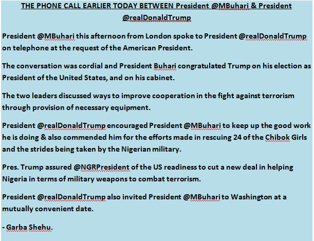 The US President “@realDonaldTrump encouraged President @MBuhari to keep up the good work he is doing & also commended him for the efforts made in rescuing 24 of the Chibok Girls and the strides being taken by the Nigerian military.”
