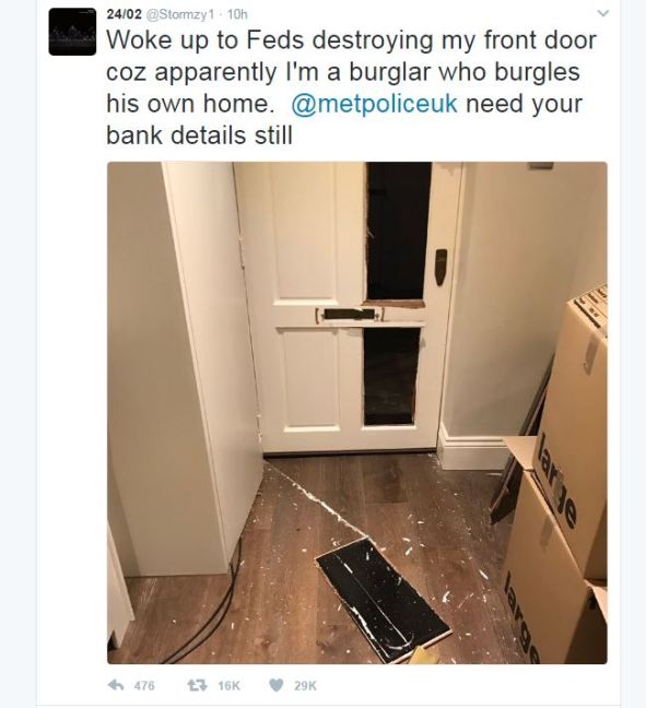 Stormzy, real name Michael Omari tweeted a picture this morning saying, “Woke up to Feds destroying my front door coz apparently I’m a burglar who burgles his own home. @MetPolice need your bank details still.”