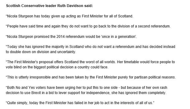 An hour ago, Ruth Davidson, leader of the Scottish Conservative also argued against a new referendum, stating that it will offer “Scotland the worst of all worlds.”