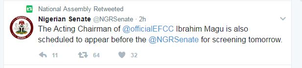 The President of the Senate, Bukola Saraki announced today that lawmakers in the upper chamber will conduct another screening for the Acting Chairman of the Economic and Financial Crimes Commission, Ibrahim Mustafa Magu tomorrow, 15 March, 2017.