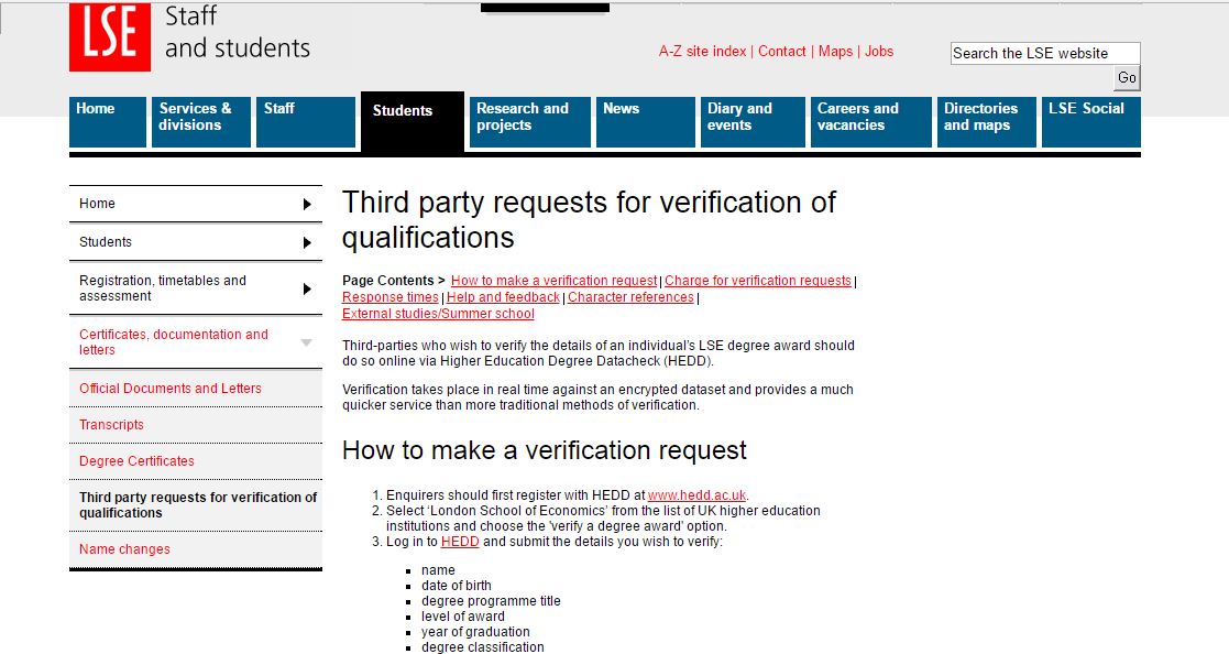 On the LSE website, “third-parties who wish to verify the details of an individual’s LSE degree award should do so online via Higher Education Degree Datacheck (HEDD)”