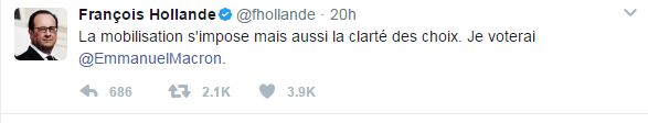 In a tweet, the outgoing President, @fhollande said he would be voting for @EmmanuelMacron so as to stop the far right candidate.