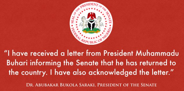 The Senate President, Bukola Saraki said he has “received a letter from President Muhammadu Buhari informing the Senate that he has returned to the country.”