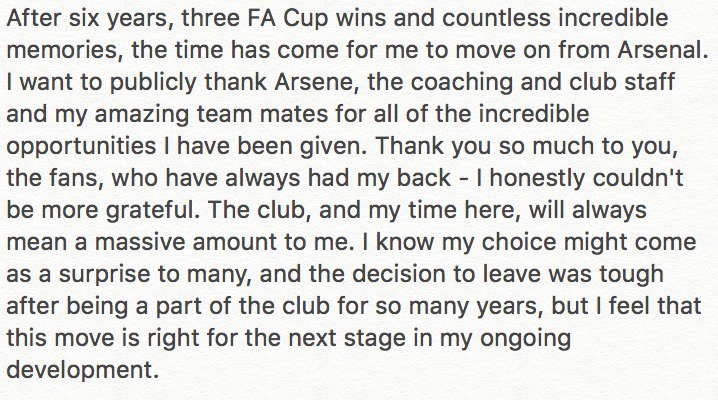“I want to publicly thank Arsene, the coaching and club staff and my amazing team mates for all of the incredible opportunities I have been given.”