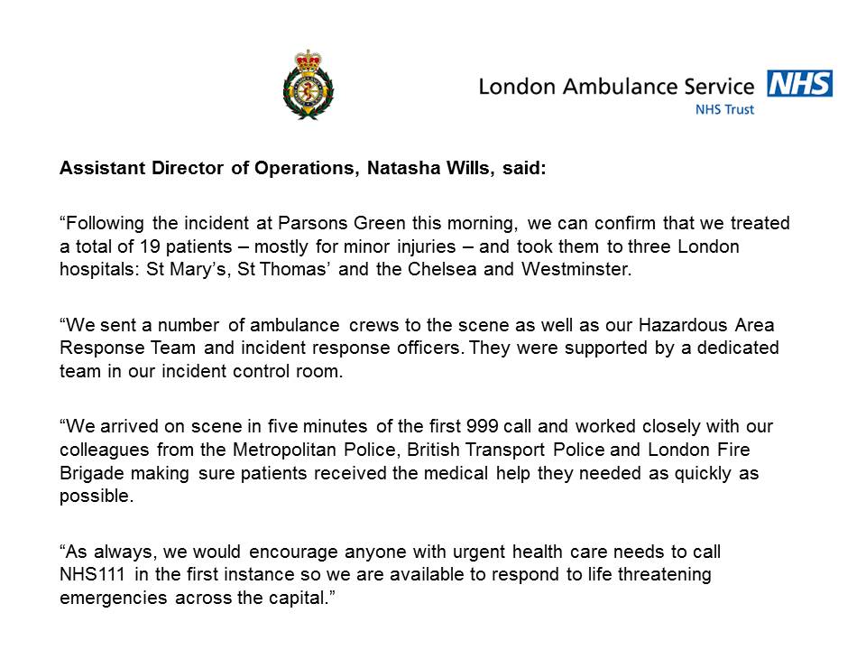 London Ambulance Service say it treated a total of 19 patients following the blast on the District line tube train which went off just around 8:20 am. None of the injuries are said to be life threatening.