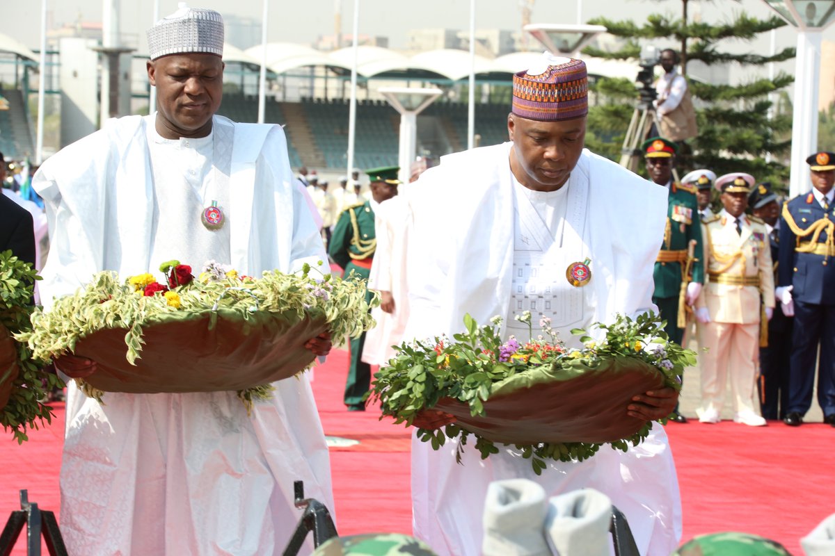 Dressed in traditional white Babariga, the President laid a wreath in honour of fallen soldiers, some of whom lost their lives in the fight against Boko Haram insurgency in the North-east.