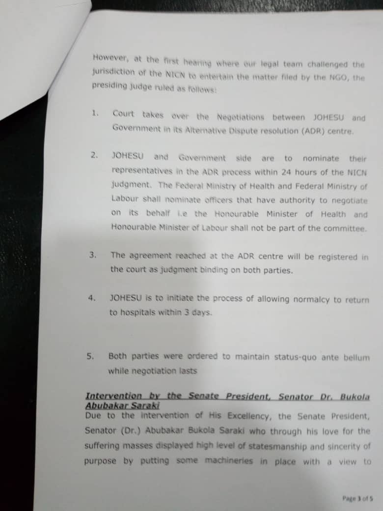 The communiqué released praised Senator Saraki for negotiating the end of the prolonged strike action.