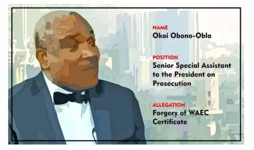 Another to have the protective silence of the President is one Okoi Obono-Obla, an appointee of the “anti-corruption” regime who the West African Examinations Council, WAEC confirmed forged his results.